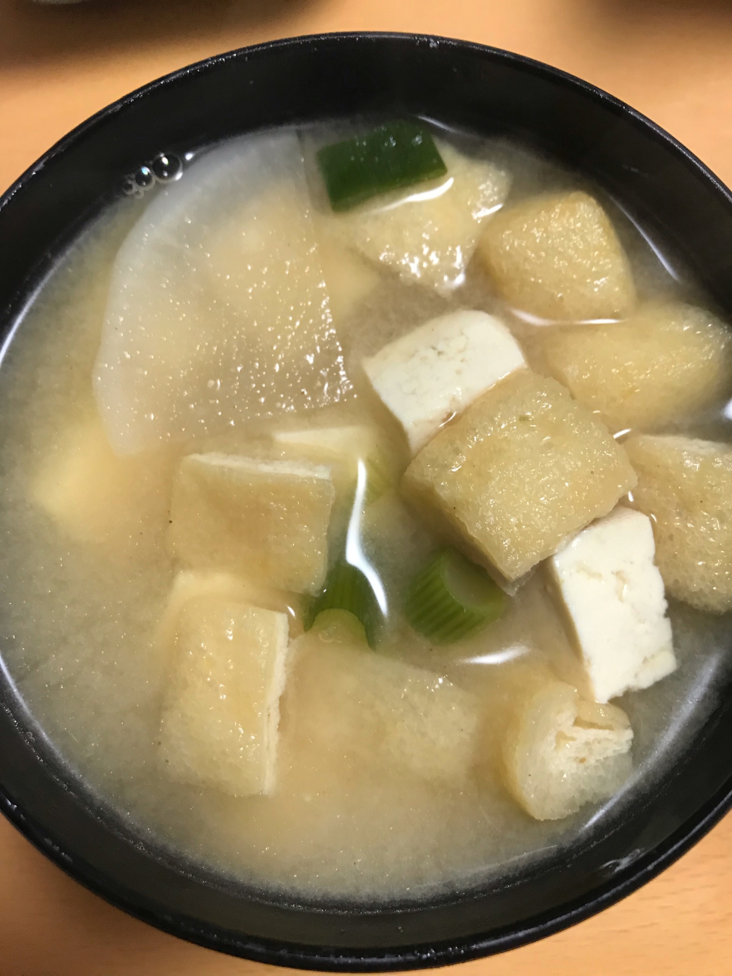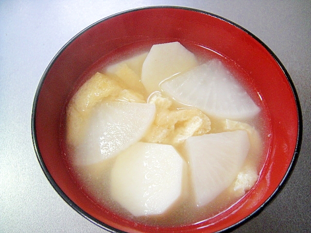 聖護院大根と油揚げのお味噌汁の作り方 聖護院大根の皮をむき、ひとくち大に切ります。 油揚げは4等分し、90度向きを変えて1cm幅に切ります。 油分が気になる場合は切った油揚げをざるに入れサッと熱湯をかけるなどして油抜きしてください。 冷凍保存しておいた油揚げは4で凍ったまま鍋に加えます。 鍋にだし汁と聖護院大根を入れて火にかけます。 アクが出大根と油揚げの味噌汁 「大根と油揚げの味噌汁」とご一緒にどうですか? 飾り寿司 30分 324kcal 煮干しだし粉 大根は短冊切りにする。油揚げは油抜きし、短冊切りにする。 2 鍋にAを入れて火にかけ、沸騰したら中火で約5分煮てだしパックを取り出す。 3 1の大根を加えて煮る。火が通っ